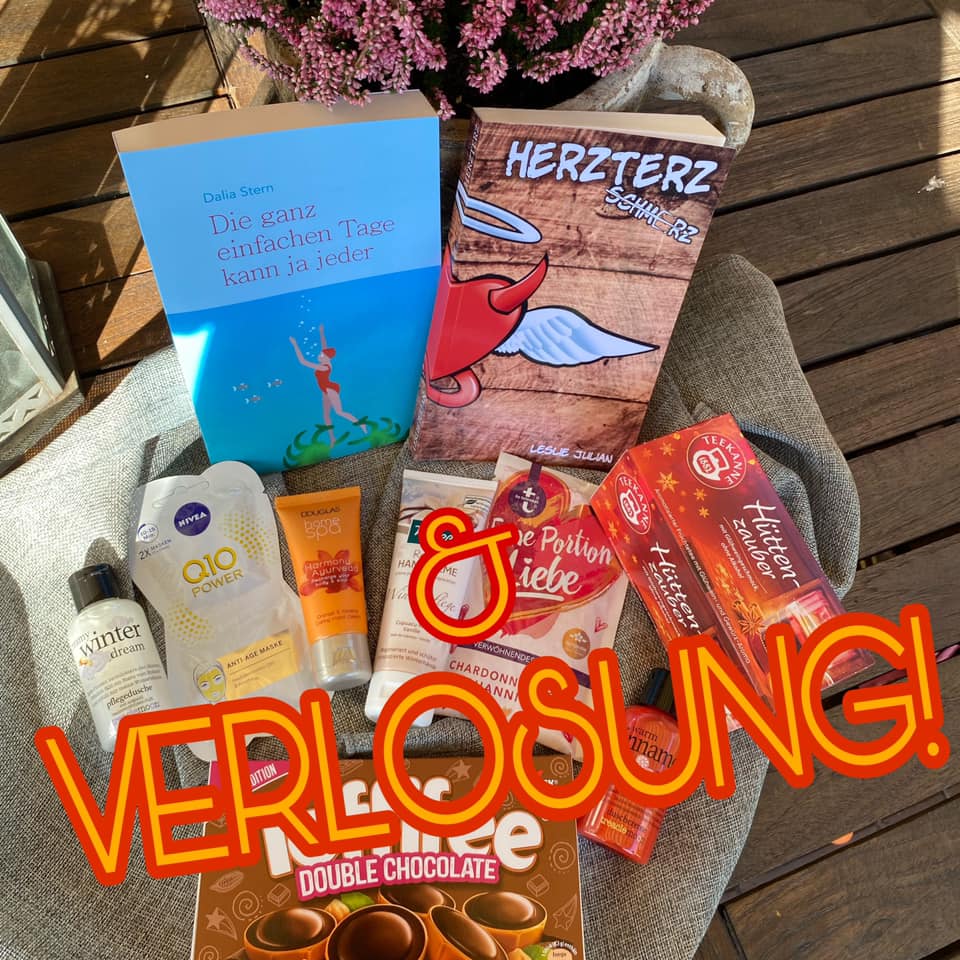 MEGA-GEWINN mit allem, was Ihr auf Bild seht. Signierte Printausgaben, Pflegeprodukte, Tee, Naschis… also alles für entspannte Lesestunden. (Ohne Tisch und Deko.)