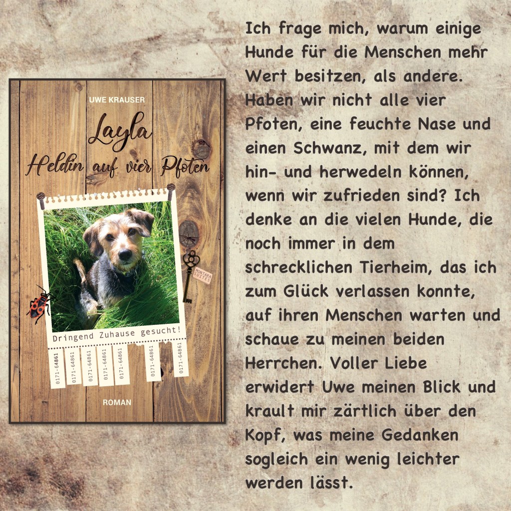 Uwe Krauser „Layla Heldin auf vier Pfoten“ Schnipsel: 7 Amazon / Website / Facebook Bewerten:Teilen mit: Freunden Auf Facebook teilen (Wird in neuem Fenster geöffnet) Facebook Gefällt mir Wird geladen …